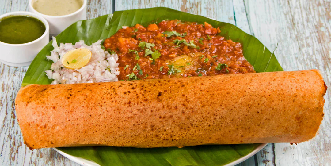 A spicy Mumbai-Style street food twist to dosa! Schezwan pav bhaji dosa combines buttery bhaji, spicy sauce, and crispy dosa for an explosion of flavors.